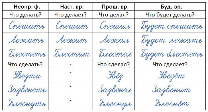 Спешить, увезти, лежать, зазвенеть, блестеть, блеснуть