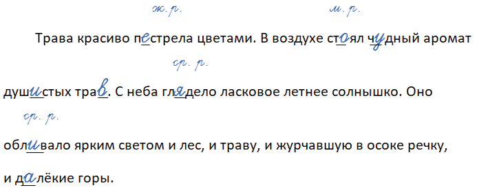 Трава красиво пестрела (жен. род) цветами. В воздухе стоял (муж. род) чудный аромат душистых трав. С неба глядело (ср. род) ласковое летнее солнышко. Оно обливало (ср. род) ярким светом и лес, и траву, и журчавшую в осоке речку, и далёкие горы.