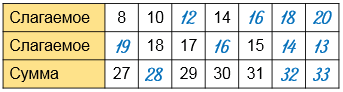 Проследи, как меняется первое слагаемое, второе, как при этом меняется их сумма. Заполни числами два последних столбца.