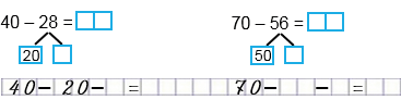 Представим число 28 в виде суммы разрядных слагаемых: 20 и 8. Удобно из 40 вычесть 20, а затем из 20 вычесть число 8. Получим 12.