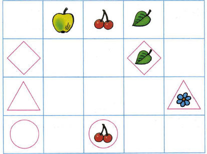 На второй строке все картинки в ромбике, на третьей строке все картинки в треугольнике, на четвертой строке все картинки в кругах.