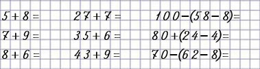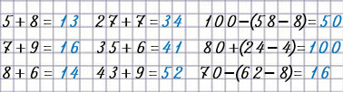 | 5 + 8 = 13 | 27 + 7 = 34 | 100 – (58 – 8) = 50 |