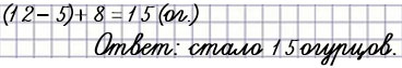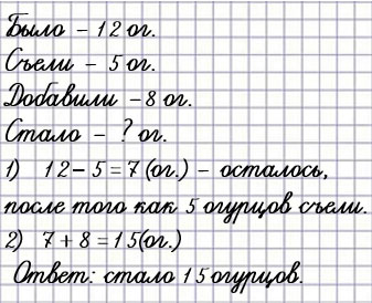 У хозяйки было 12 огурцов. Из них 5 огурцов съели, а потом она сорвала с грядки ещё 8 огурцов. Сколько огурцов стало у хозяйки?