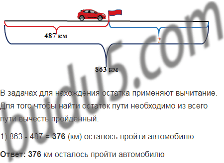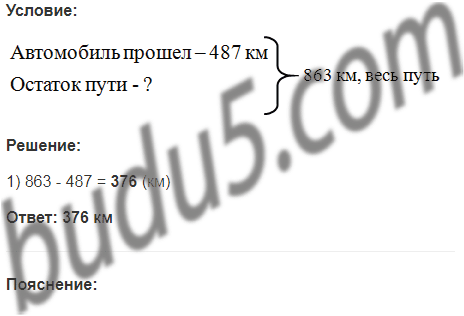 Автомобиль должен пройти 863 км. В первый день он прошел 487 км. Сколько километров ему осталось пройти?