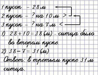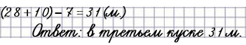 В первом куске 28 м ситца, во втором на 10 м больше, чем в первом, а в третьем на 7 м меньше, чем во втором. Сколько метров ситца в третьем куске?
