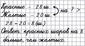 У продавца 28 красных воздушных шариков и 20 жёлтых. На сколько больше у продавца красных шариков, чем жёлтых?