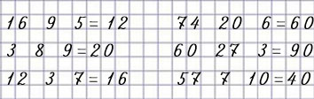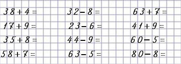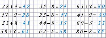 | 38 + 4 = 42 | 32 – 8 = 24 | 63 + 7 = 70 |