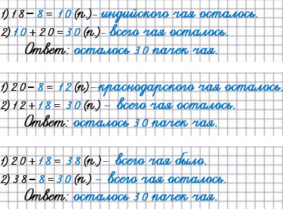 Для школьного буфета купили 18 пачек индийского чая и 20 пачек краснодарского. Израсходовали 8 пачек. Сколько пачек чая осталось?