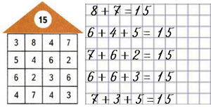 Из чисел, записанных в домике, набери число 15. Запиши пять равенств.