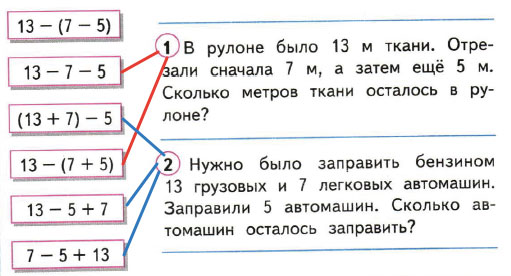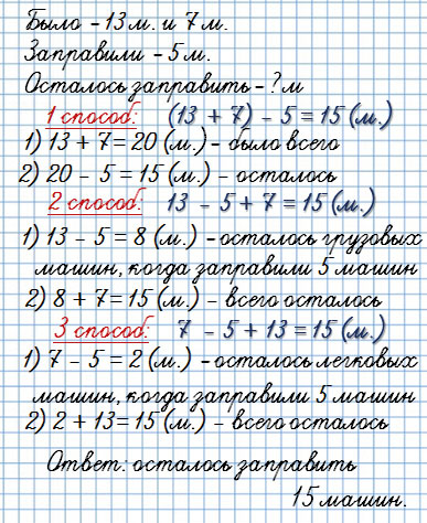 2 способ: Представим, что заправили только грузовые машины, тогда из 13 вычтем 5 машин, которые уже заправили и к полученному числу добавим количество легковых машин, которые тоже нужно заправить.