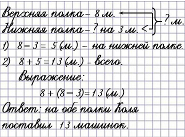 Коля поставил на верхнюю полку 8 машинок, а на нижнюю на 3 машинки меньше. Сколько всего машинок Коля поставил на обе полки?