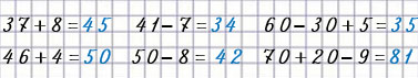 | 37 + 8 = 45 | 41 - 7 = 34 | 60 - 30 + 5 = 35 |