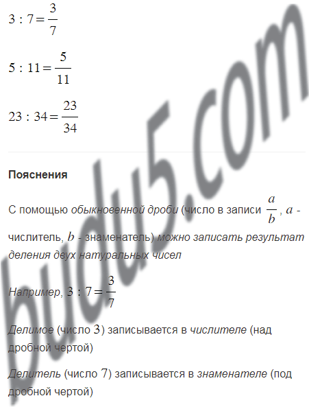 Запишите в виде дроби частные: 3 : 7; 5 : 11; 23 : 34.