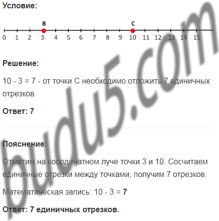 Начертите координатный луч и отметьте на нем точки В (3) и С (10). Сколько единичных отрезков надо отсчитать от точки С и в какую сторону, чтобы получить точку В?