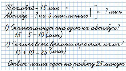 7. Мама едет на работу сначала на трамвае 15 мин, а потом на автобусе на 5 мин меньше, чем на трамвае. Придумай вопрос и реши задачу.