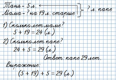 6. Тане 5 лет, мама на 19 лет старше Тани, а папе столько лет, сколько Тане и маме вместе. Задай вопрос и реши задачу.