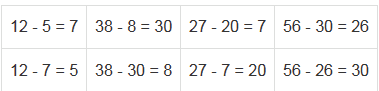 12 - 5 = 7 38 - 8 27 - 20 56 - 30