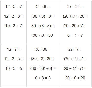 12 - 7 = 5 38 - 30 27 - 7 56 - 20