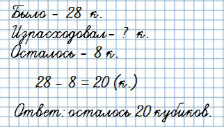 3. В коробке было 28 кубиков. Из нескольких кубиков Костя построил башню, после чего в коробке осталось 8 кубиков.