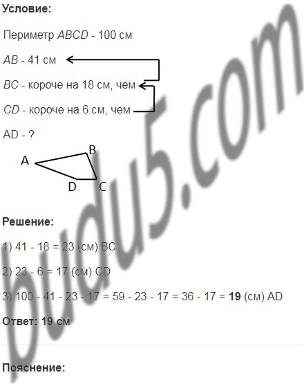 Периметр четырехугольника ABCD равен 100 см. Сторона AB равна 41 см, сторона BC короче стороны AB на 18 см, но длиннее стороны CD на 6 см. Найдите длину стороны AD.