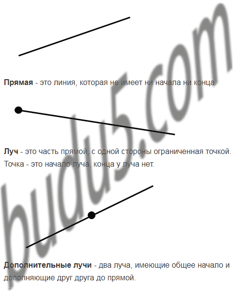 Посмотрите в словаре соответствующие термины: луч, отрезок, прямая, дополнительные лучи.