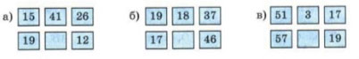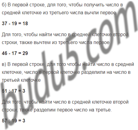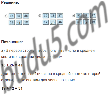 Проанализируйте, какое арифметическое действие совершают с числами по краям, чтобы получить число в средней клетке в первой строке. По такому же принципу будет получаться число в средней клетке во второй строке.