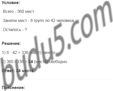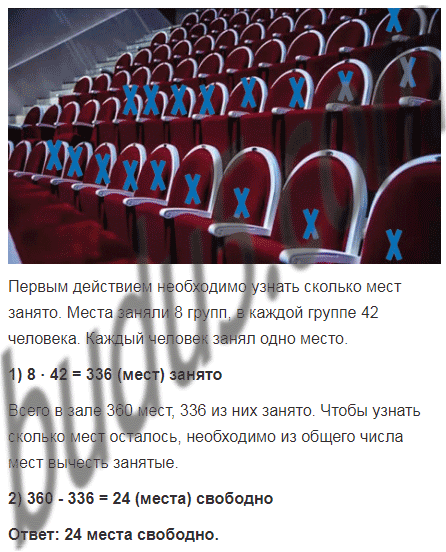 Зрительный зал имеет 360 мест. Сколько осталось свободных мест поле того, как 8 групп по 42 человека в каждой заняли свои места?