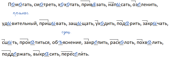 П_м_гать, см_треть, х_х_тать, прив_зать, нап_сать, оз_ленить, уд_вительный, приш_вать, защ_щать, ух_дить, под_рить, закр_чать, сш_ть, прок_титься, об_яснение, закр_пить, раск_лоть, похв_лить, подд_ржать, выкр_сить, перес_лить.