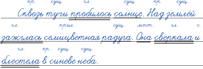 Сквозь (предлог) тучи (им. сущ.) пробилось (глагол) солнце (им. сущ.). Над (предлог) землёй (им. сущ.) зажглась (глагол) семицветная (им. прил.) радуга (им. сущ.). Она (мест.) сверкала (глагол) и (союз) блестела (глагол) в (предлог) синеве (им. сущ.) неба (им. сущ.).