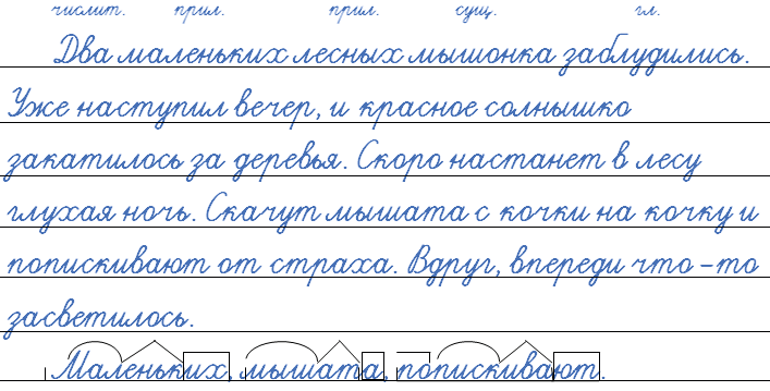 1. Два (числ.) маленьких (им. прил.) лесных (им. прил.) мышонка (им. сущ.) заблудились (глагол). 2. Уже наступил вечер, и красное солнышко закатилось за деревья. 3. В лесу скоро настанет глухая ночь. 4. Скачут мышата с кочки на кочку и попискивают от страха. 5. Вдруг что-то засветилось впереди.