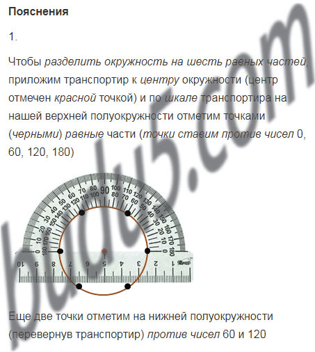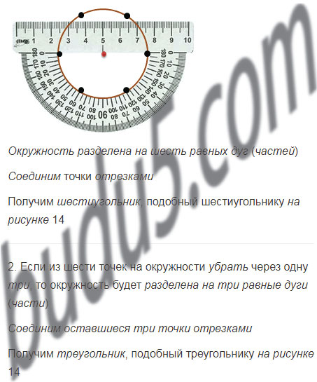 С помощью транспортира разделите одну окружность на 6, а другую — на 3 равные дуги. Постройте многоугольники, изображённые на рисунке 14.