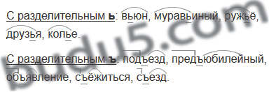 Самодиктант. Подбери и запиши по пять слов с разделительным ь и разделительным ъ. Обозначь эти орфограммы.