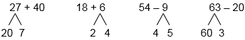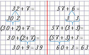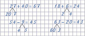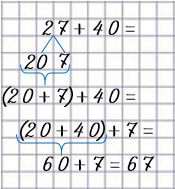27 можно представить в виде суммы чисел 20 и 7. Сначала к 20 прибавляю 40, получаю 60, затем к 60 прибавляю еще 7, получаю 67.