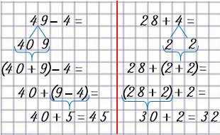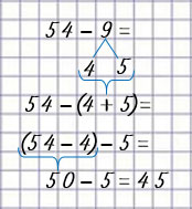 9 можно представить в виде суммы чисел 4 и 5. Сначала из 54 вычитаю 4, получаю 50, затем из 50 вычитаю еще 5, получаю 45.