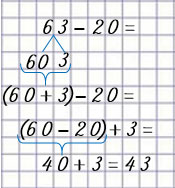 63 можно представить в виде суммы чисел 60 и 3. Сначала из 60 вычитаю 20, получаю 40, затем к 40 прибавляю число 3, получаю 43.