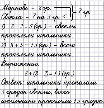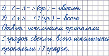 5. Школьники пропололи 8 грядок моркови, а свеклы на 3 грядки меньше. Сколько грядок свеклы они пропололи? Сколько всего грядок пропололи школьники?