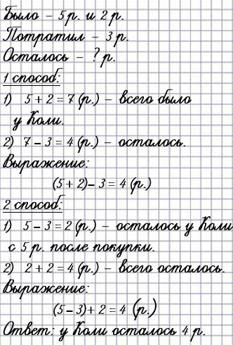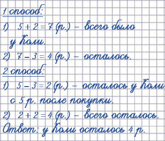 6. У Коли было 50 р. и 20 р. Он купил билет в музей за 40 р. Сколько рублей осталось у Коли. Сколькими способами можно решить эту задачу?