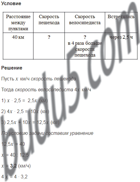 Из двух пунктов, расстояние между которыми 40 км, навстречу друг другу одновременно отправились пешеход и велосипедист. Скорость велосипедиста в 4 раза больше скорости пешехода. Найдите скорости пешехода и велосипедиста, если известно, что они встретились через 2,5 ч после своего выхода.