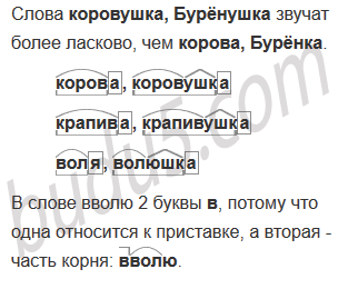 Прочитай отрывок из русской народной песенки. Какие слова звучат нежно, ласково? Прочитай их. Сравни слова: корова и коровушка, Бурёнка и Бурёнушка. Чем они отличаются?