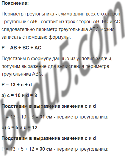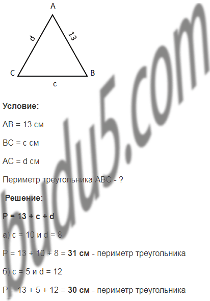 Найти периметр треугольника АВС, если АВ = 13 см, ВС = с см и АС = d см. Составьте выражение и найдите его значение при: