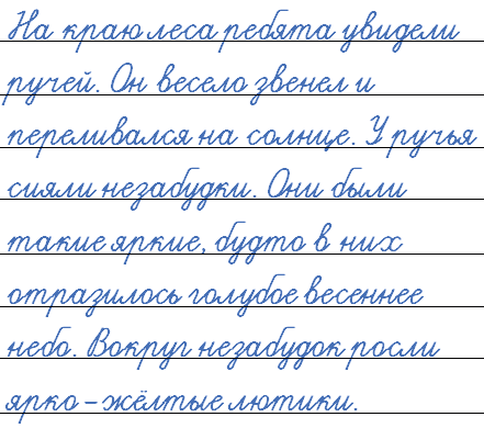 2. На краю леса ребята увидели ручей. Он весело звенел и переливался на солнце. У ручья сияли незабудки. Они были такие яркие, будто в них отразилось голубое весеннее небо. Вокруг незабудок росли ярко-жёлтые лютики.