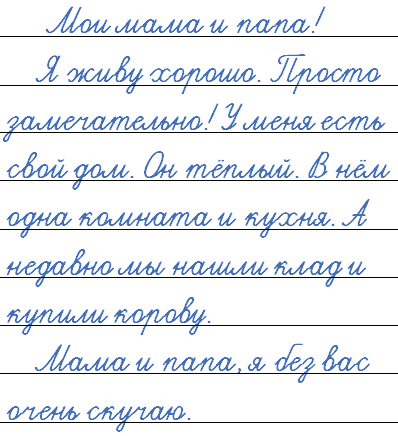 Я живу хорошо. Просто замечательно! У меня есть свой дом. Он тёплый. В нём одна комната и кухня. А недавно мы нашли клад и купили корову.