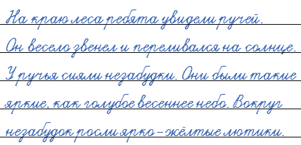 2. На краю леса ребята увидели ручей. Он весело звенел и переливался на солнце. У ручья сияли незабудки. Они были такие яркие, как голубое весеннее небо. Вокруг незабудок росли ярко-жёлтые лютики.