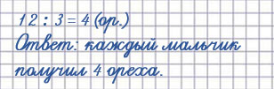 4. Коля разделил 12 орехов поровну — себе и двум своим друзьям. Сколько орехов получил каждый?