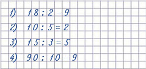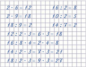 | 9 • 2 = 18 | 10 : 2 = 5 | 14 : 7 = 2 |