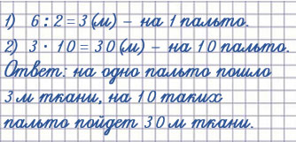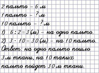 Ответ: 3 м ткани пошло на 1 пальто, на 10 пальто нужно 30 м ткани.