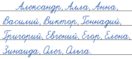 Григорий, Евгений, Анна, Алла, Зинаида, Василий, Егор, Елена, Александр, Ольга, Геннадий, Виктор, Олег.
