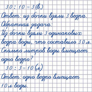 Из бочки взяли 3 одинаковых ведра воды, что составило 30 л. Сколько литров воды было в одном ведре?