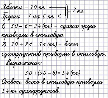 6. Для школьной столовой привезли сухие фрукты: яблок 30 кг, а груш на 6 кг меньше.