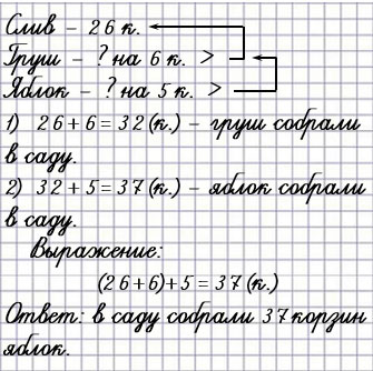 7. В саду собрали 26 корзин слив, груш на 6 корзин больше, чем слив, а яблок на 5 кор­зин больше, чем груш. Сколько корзин яблок собрали в саду?